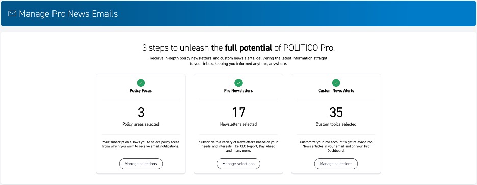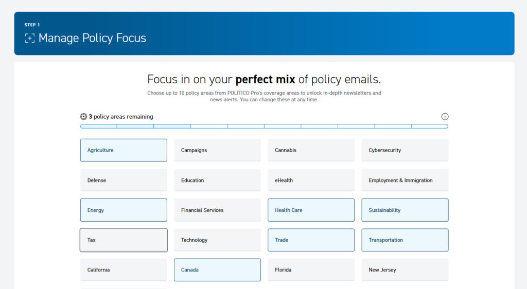 POLITICO Pro’s subscription plans allow you the flexibility to customize your content feed base on Policy Areas. You have complete control over what is delivered to your inboxes daily and the option to change your Policy Areas at any time.